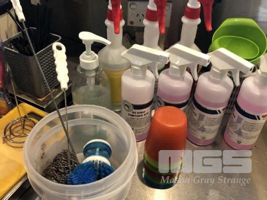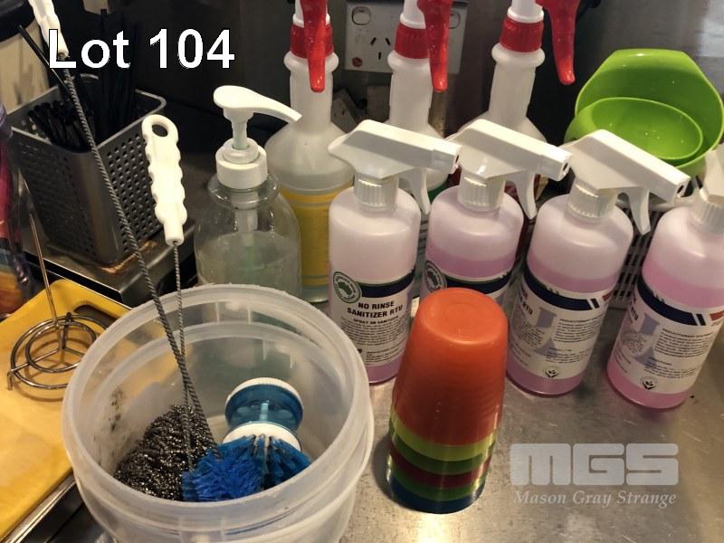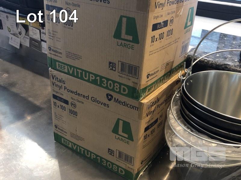 QUANTITY OF CLEANING PRODUCTS INCLUDING SANITISER, STAINLESS STEEL POLISH, OVEN & GRILL CLEANER, ICE BUCKETS, GLASS TRAYS, 2000 x VITALS VINYL POWDERED GLOVES IN BOX