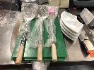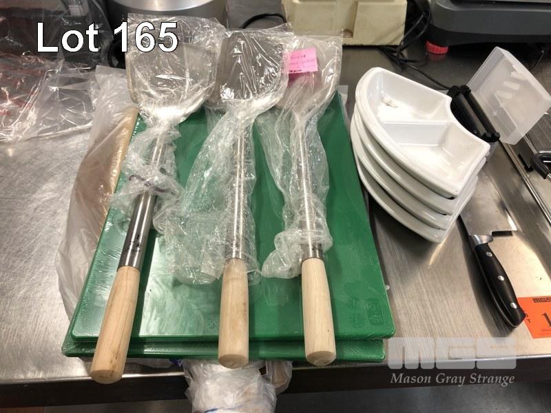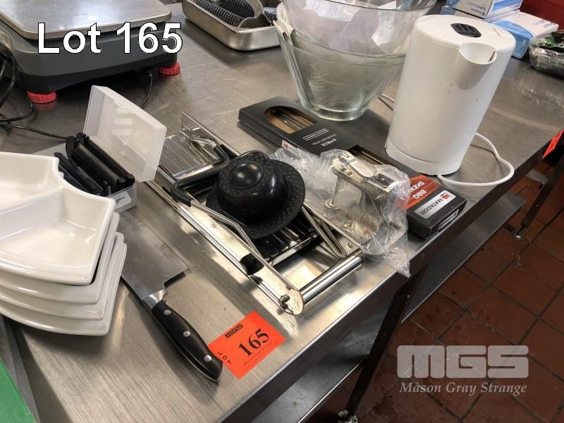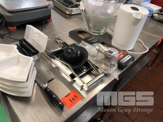 ASSORTED COOKING EQUIPMENT, INCLUDING CHOPPING BOARDS, CHEESE PADDLES, MANUAL GRATER, SKEWERS, SPATULAS, KETTLE, GLASS SALAD BOWLS, ETC