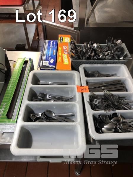 3 x CUTLERY TRAYS WITH APPROX 300+ KNIVES, FORKS, SPOONS WITH GLAD WRAP & BAKING PAPER