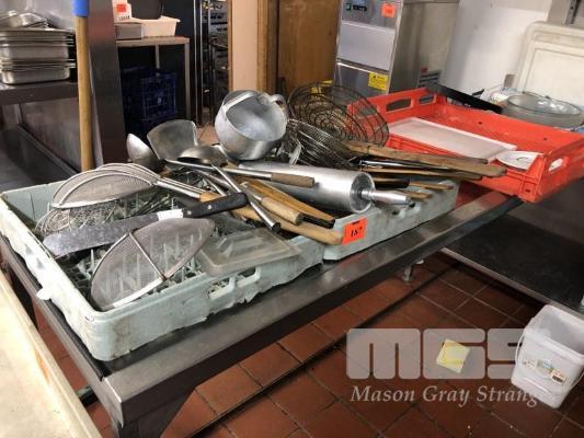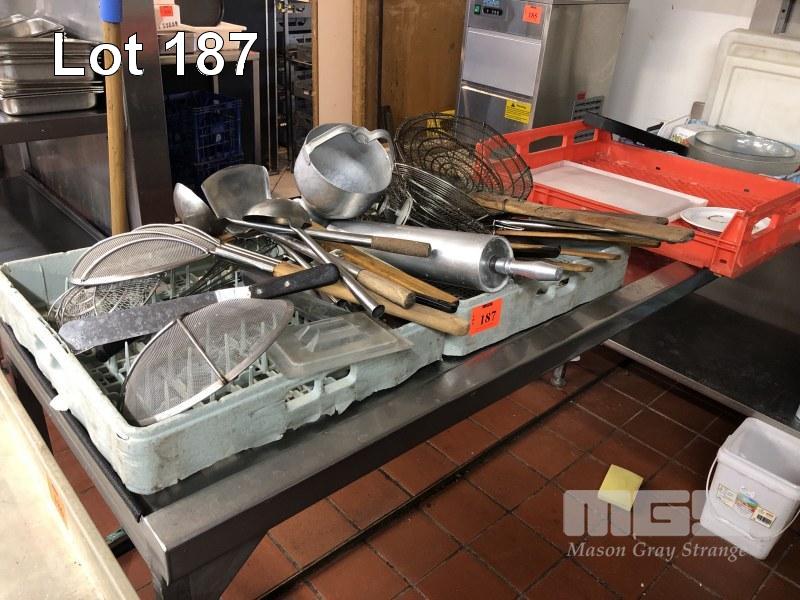2 x TRAYS COOKING UTENSILS INCLUDING ROLLING PIN, SIEVES, LADLES & DOUGHNUT SHAPER