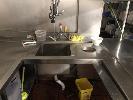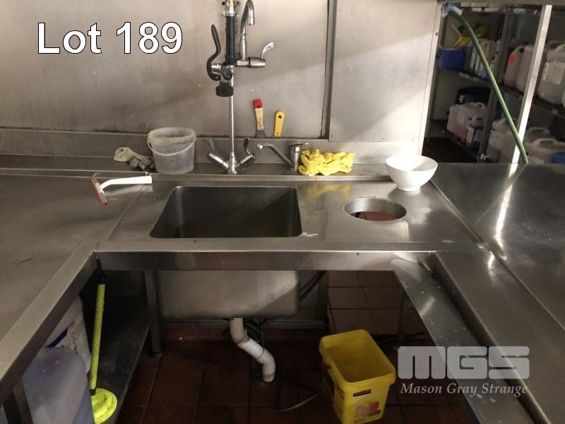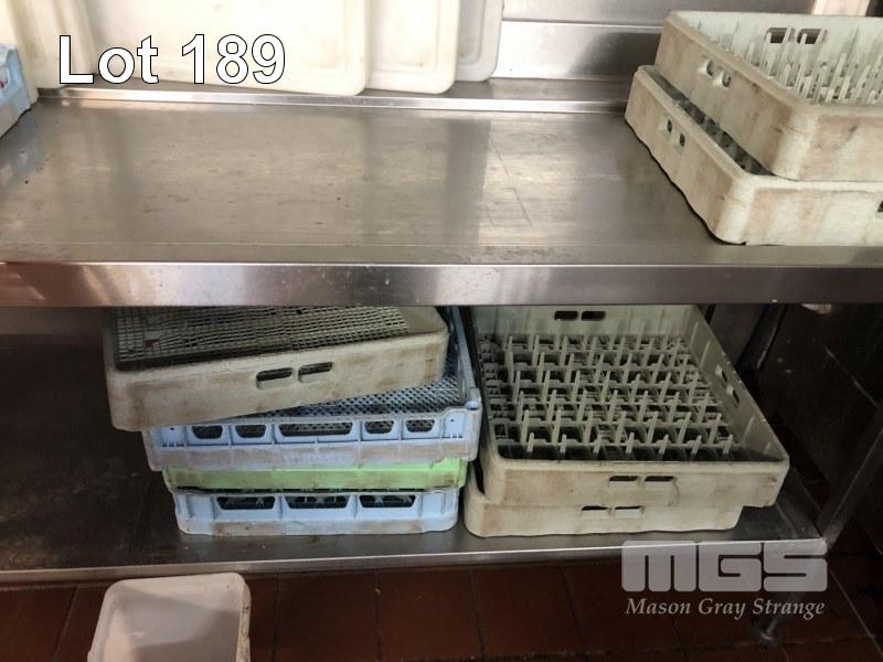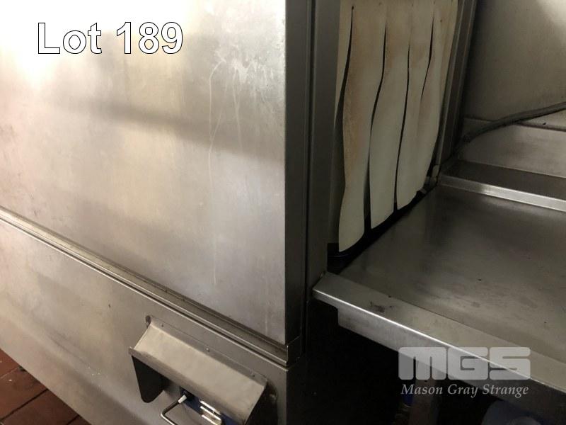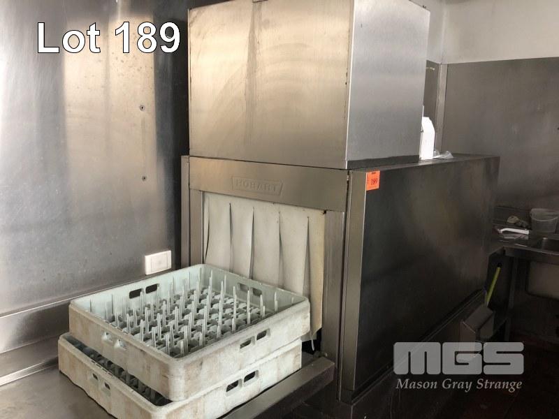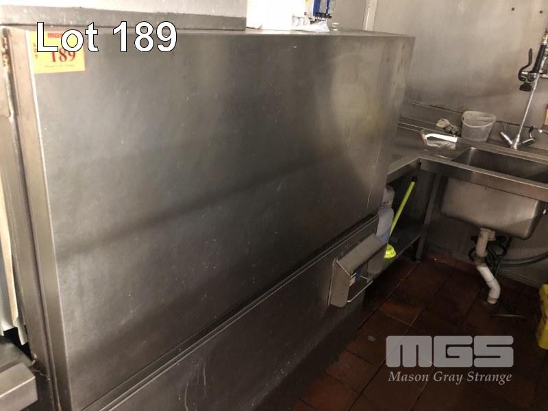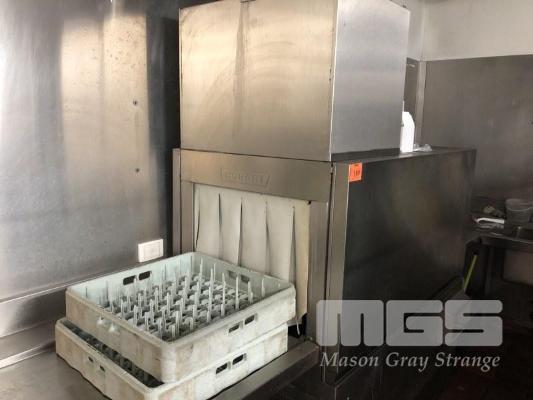 COMMERCIAL FLOW THROUGH DISHWASHER, HOBART MOD: CS-A-91 2 TRAY CAPACITY 1350 x 790 x 1500mm STAINLESS STEEL CASED WITH 7 x TRAYS STEAM EXHAUST 415V WITH U-SHAPED STAINLESS FILL IN & OUT BENCHING WASH DOWN SINK OVERHEAD SHELF 3200 x 1700 x 2200 x 1700mm