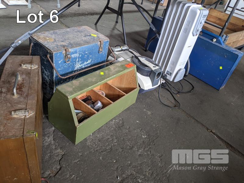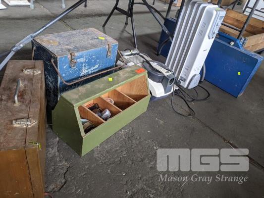 CLASSIC METAL ESKY, BOOT CLEANING KIT, VACUUM CLEANER, OIL HEATER, FOLDING CAMP TABLE SET & WOODEN BOX
