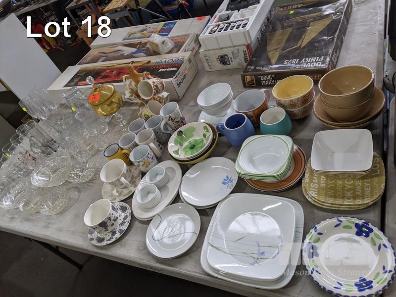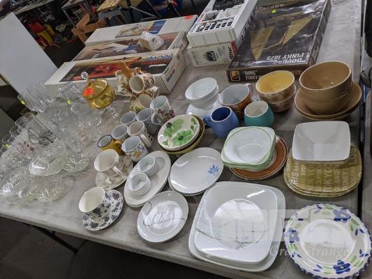 GLASSWARE, BOWLS, CUPS, CROCKERY, PLATES, SAUCERS, ETC, 1 x TABLE