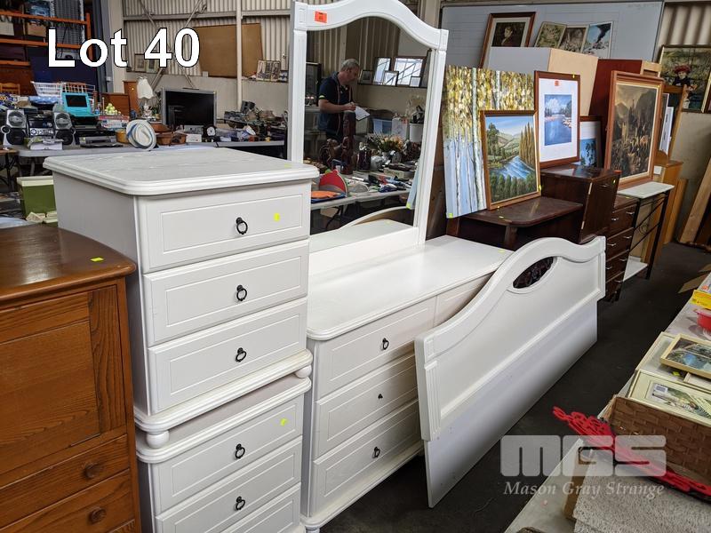 BEDROOM DRESSING TABLE, WHITE TIMBER, 6 x DRAWER, MIRROR BACK WITH 2 x 3 DRAWER BEDSIDE TABLE & BED END, ALL MATCHING