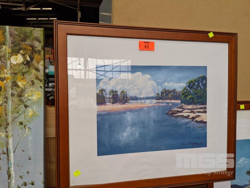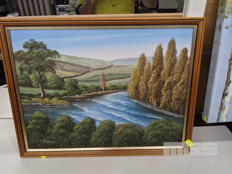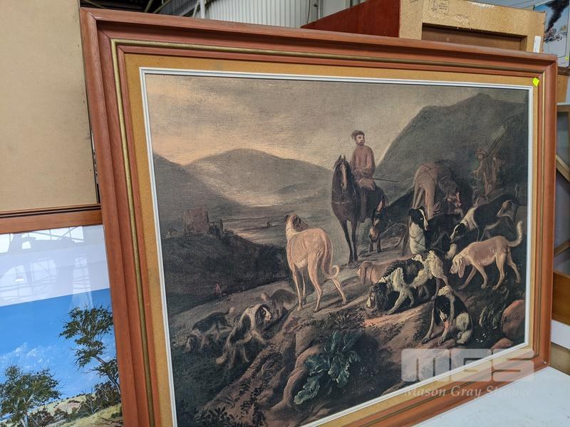 4 x FRAMED OIL PAINTINGS, ASSORTED LANDSCAPES, INC ANCHEWS, KEN BYTMS, G. BARNETT, ETC & 1 x HUNTING DOGS PRINT