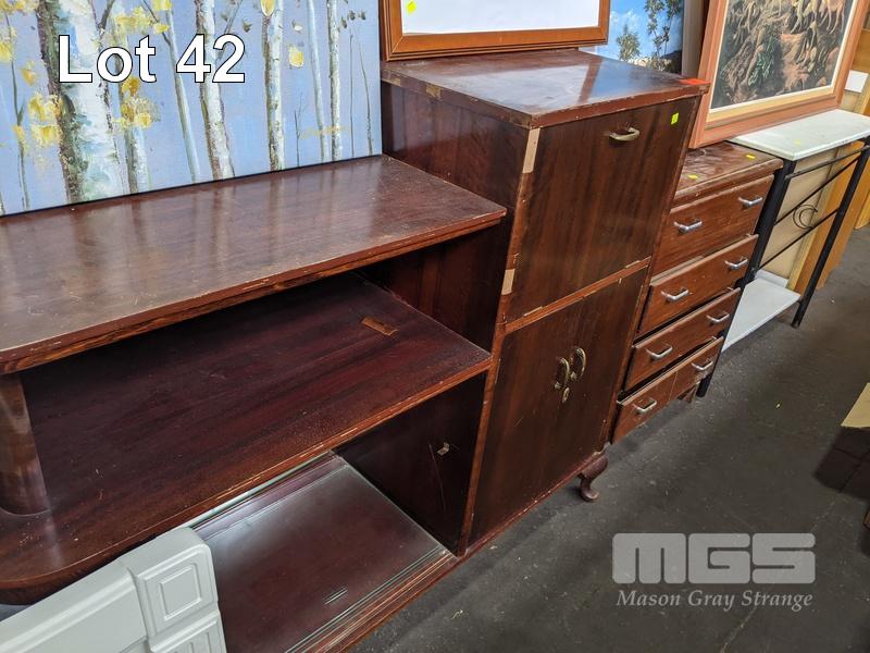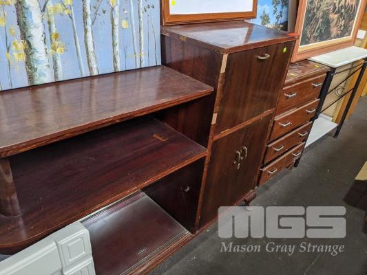 LIQUOR CABINET, DARK STAINED TIMBER, 3 x DOOR WITH HINGED SELF LIFTING TOP, MIRRORED INTERIOR & 3 x SHELVES, WITH 4 DRAWER STAND & 2 TIER SHELF UNIT