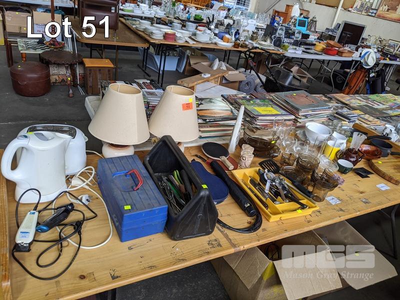 HAND TOOLS, KETTLE, TOASTER, PAIR LAMPS, GLASSWARE & KITCHENWARE, 1 x TABLE