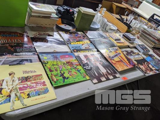 40 (APPROX) x ASSORTED VINYL RECORDS, INC CREAM, THE KINKS, BLONDIE, ANIMALS, CREEDENCE, ETC, 1 x TABLE
