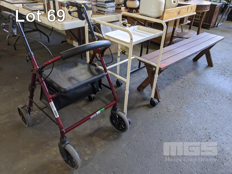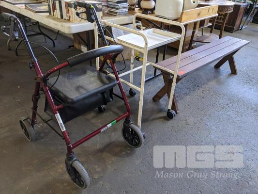 TIMBER OUTDOOR BENCH SEAT. PEAK ELLIPSE 8" ROLLATOR WALKING AID (RED). WALSH TRAY TROLLEY WALKER.