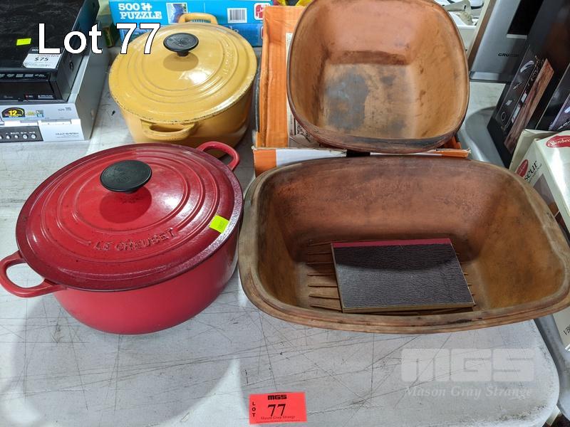 2 x LE CREUSET CAST IRON ENAMEL COATED CASSEROLE POTS WITH LIDS & ROMERTOPF CLAY COOKWARE