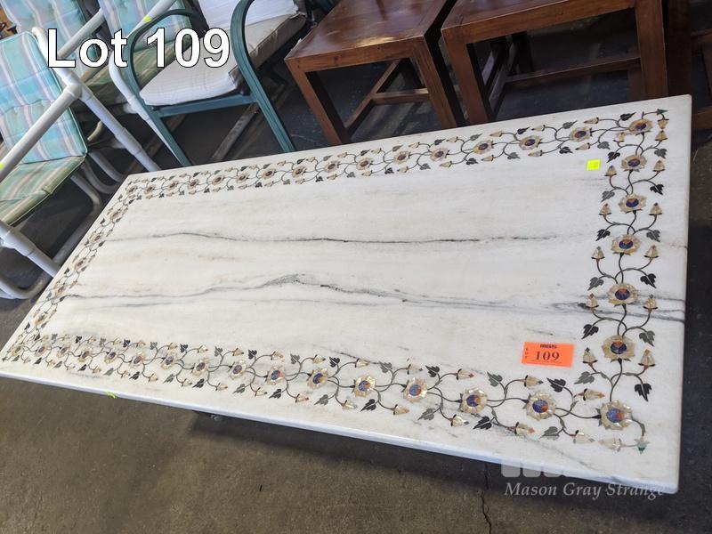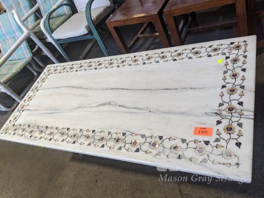 MARBLE TOPPED COFFEE TABLE WITH MOTHER OF PEARL FLOWER INLAYS, TIMBER FRAME ON CASTORS.