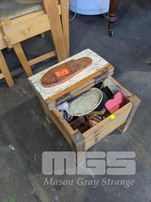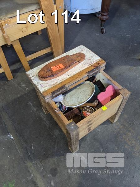TIMBER SHOE POLISH BOX STAND & QUANTITY POLISH & BRUSHES