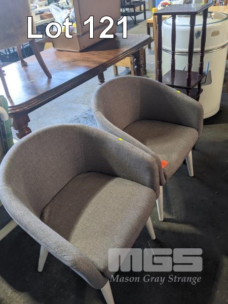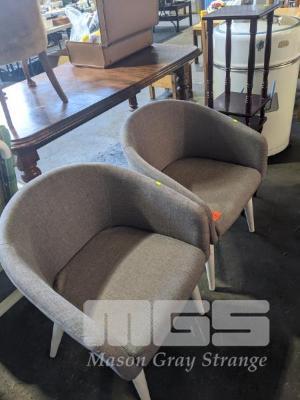 PAIR VISITORS CHAIRS, GREY CLOTH TRIM, WHITE METAL FRAME & PAIR MATCHING SIDE STANDS, DARK STAINED TIMBER, 2 TIER