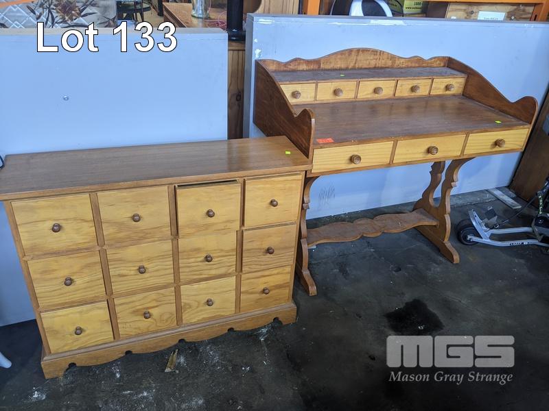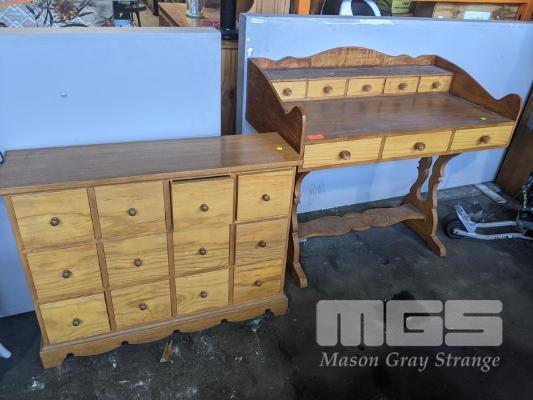 WRITING DESK, STAINED PINE, 8 x DRAWER WITH DRAWER STAND, STAINED PINE, 12 x DRAWER