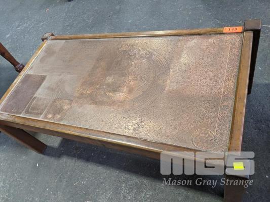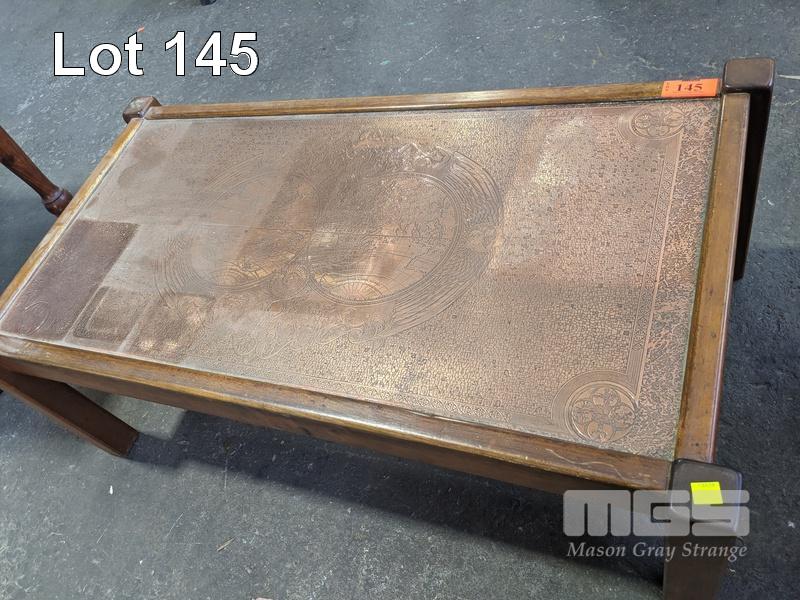 COFFEE TABLE, DECORATIVE PRESSED COPPER TOP WITH GLOBAL MAPS, TIMBER FRAME
