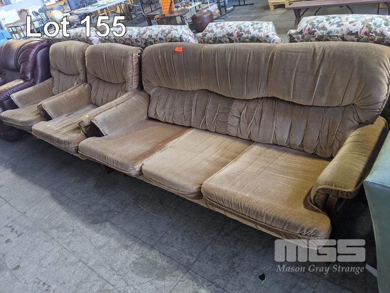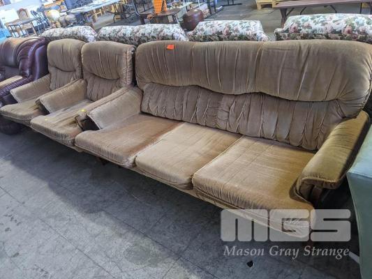 3 PIECE LOUNGE SUITE, 3 SEATER & 2 x SINGLE SEATERS, BROWN VELOUR & TIMBER FRAME