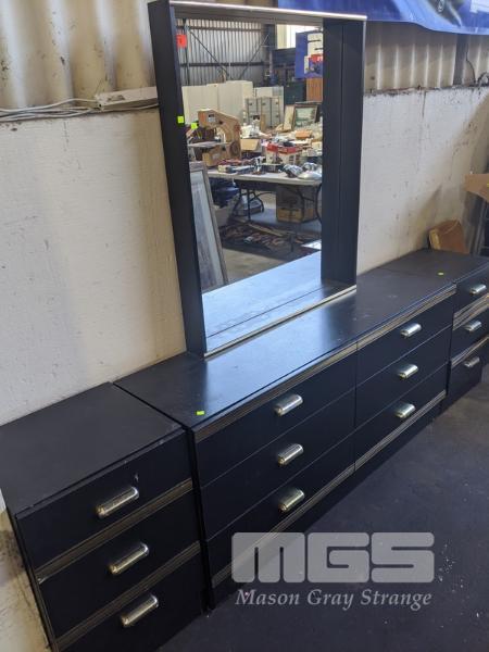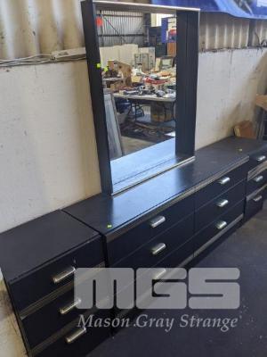 BEDROOM DRESSER SET, BLACK TIMBER LAMINATE & GOLD TRIM MIRROR BACK, 6 x DRAWER WITH 2 x 3 DRAWER BEDSIDE UNITS
