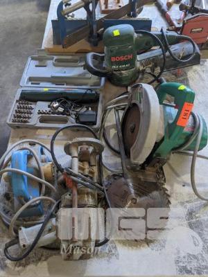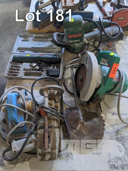 RYOBI CIRCULAR SAW, MOD: HW-600, SKILL DRILL WITH ROUTER ATTACHMENT, MAKITA 80mm POWER PLANER, BOSCH PEX400 AE ORBITAL SANDER & HOUSTON POWER SCREWDRIVER & BITS