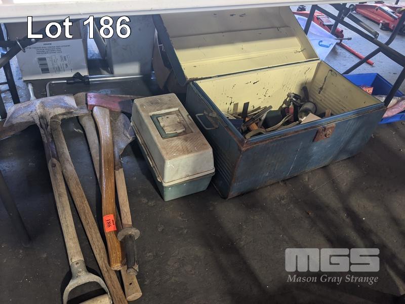 SHOVEL, AXE, PICK & MATIC, STEEL TOOL CHEST & ASSORTED HAND TOOLS WITH VICE GRIPS, CLAMPS, BORE HONE, ETC