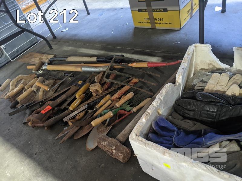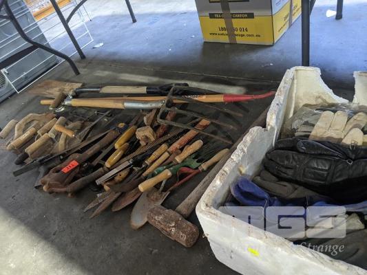 CONCRETE TROWELS, GARDEN TOOLS, SLEDGE HAMMER, SAWS & 1 x BOX LEATHER WORK GLOVES