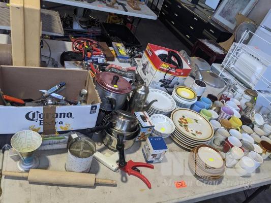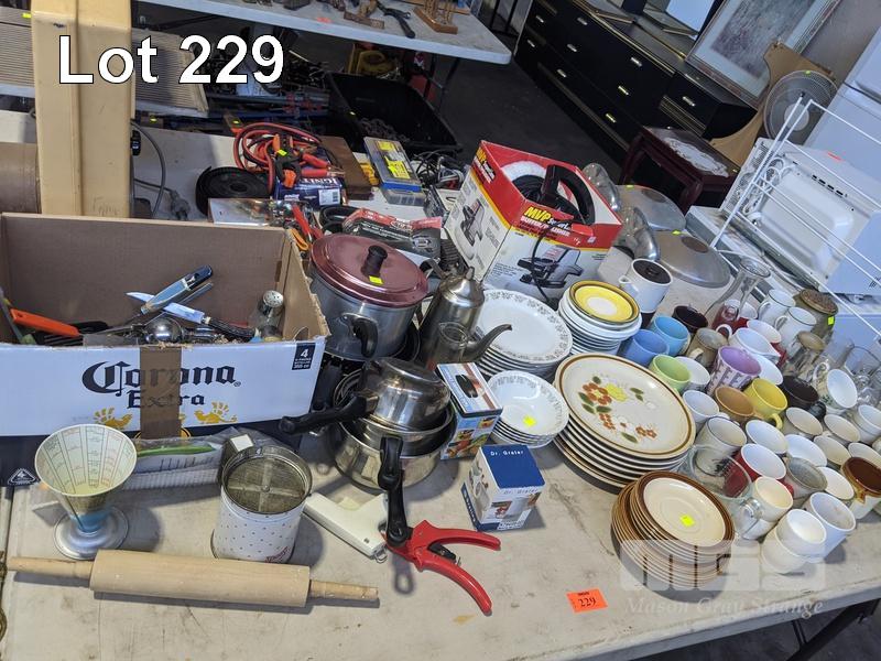 ASSORTED KITCHEN & TABLEWARE, COOKWARE, CUPS & MUGS, 1 x TABLE, 1 x BOX