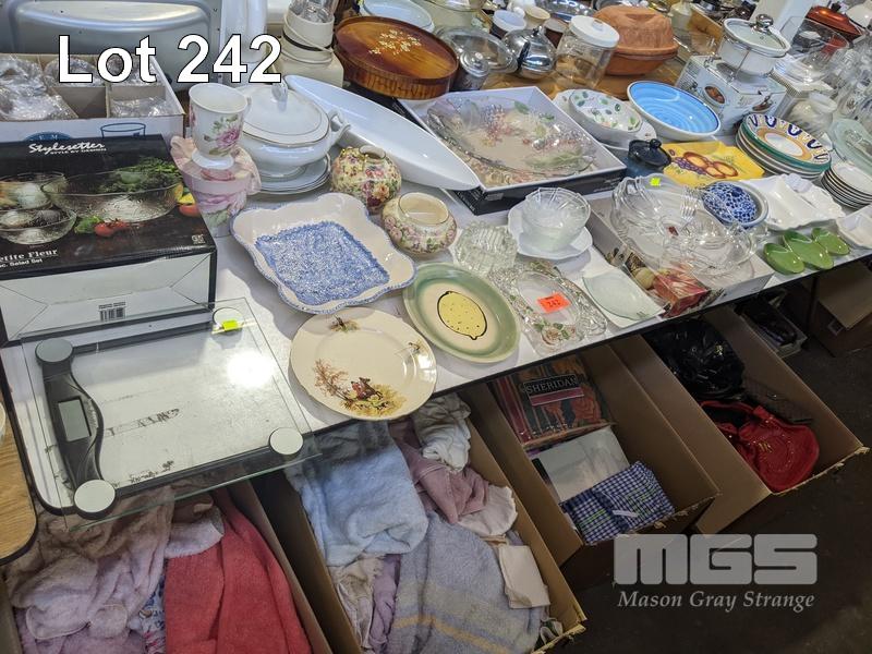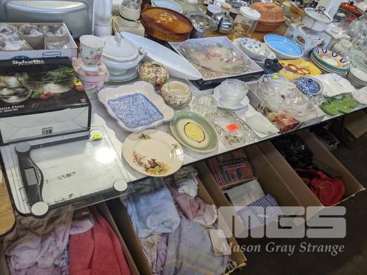 ASSORTED SERVING PLATES, PLATTERS & TRAYS, (1 x TABLE), 2 x BOXES LINEN & 1 x BOX HANDBAGS