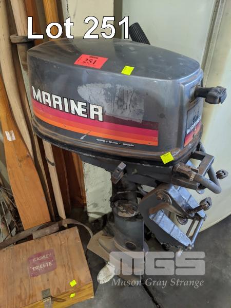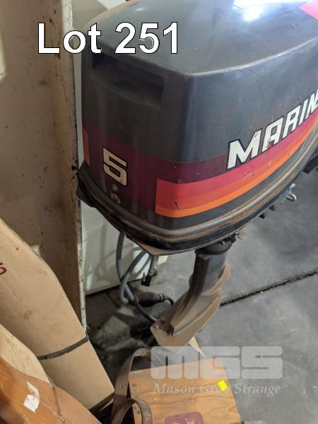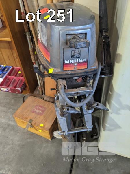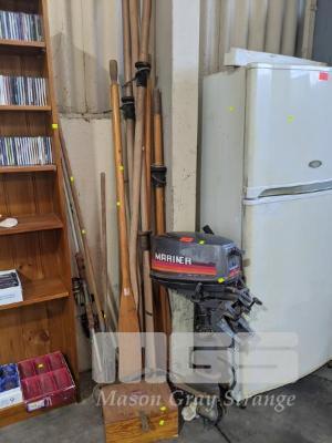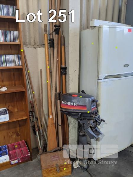 MARINER 5, 2 STROKE OUTBOARD ENGINE CONDITION UNKNOWN, WOODEN OARS & FISHING RODS, ETC