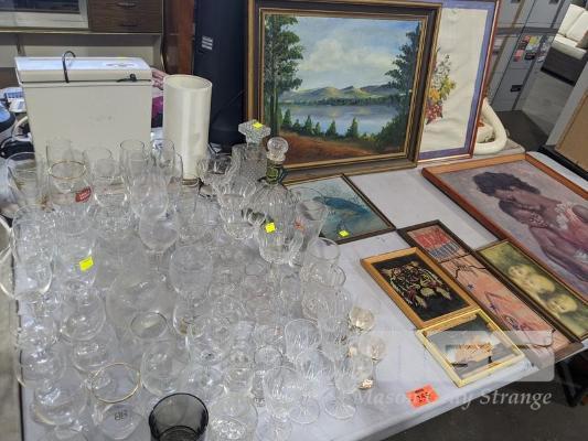 ASSORTED GLASSWARE & COLLECTION FRAMED PRINTS, 1 x TABLE