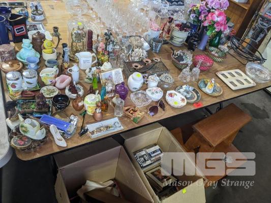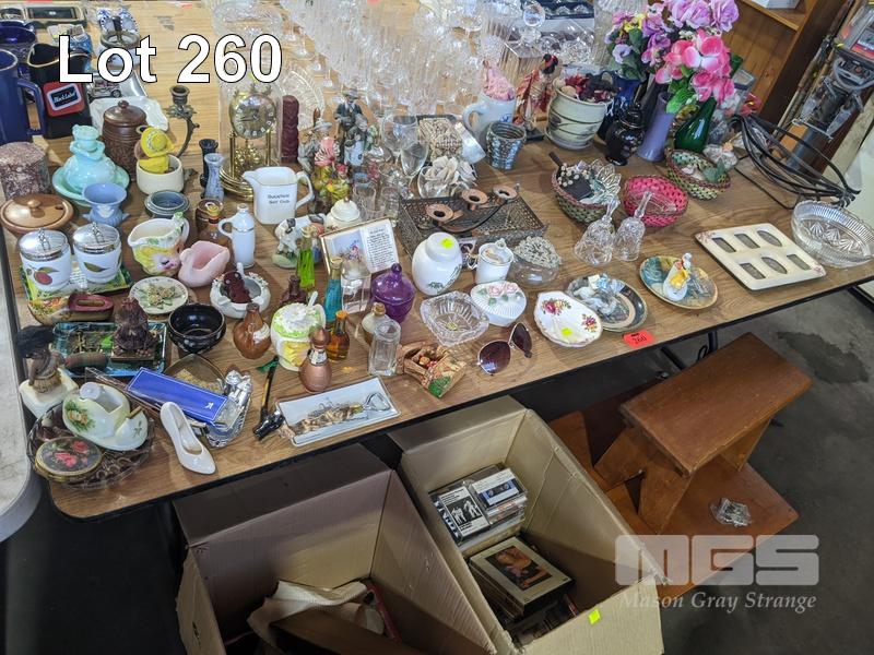 FIGURINES, VASES, ASHTRAYS, COLLECTABLES, TROPHIES, DVD'S & FOOT STOOLS, 1 x TABLE, 2 x BOXES