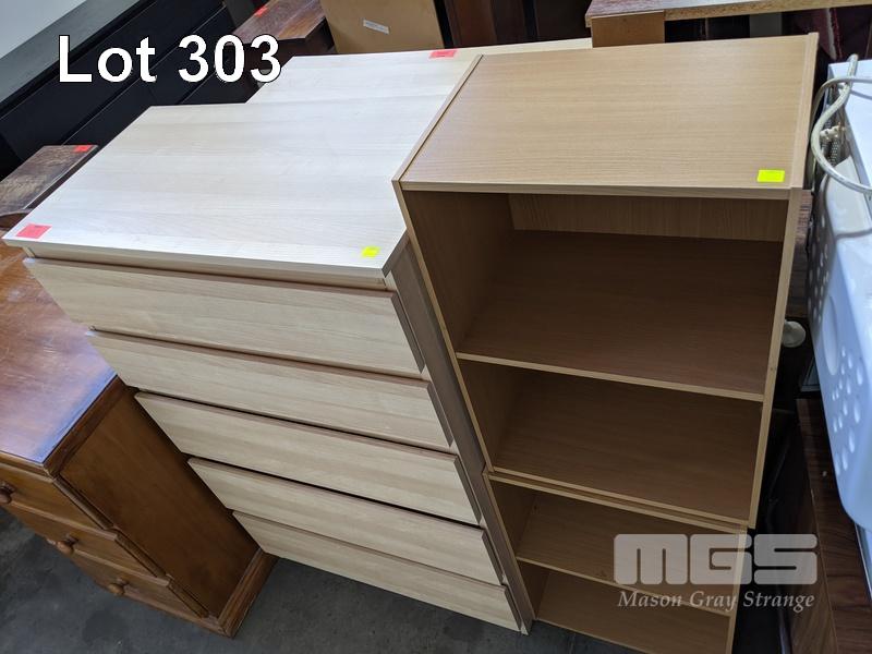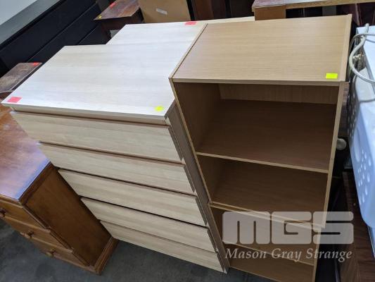 5 DRAWER DRESSER & 2 x BEDSIDE SHELF UNITS