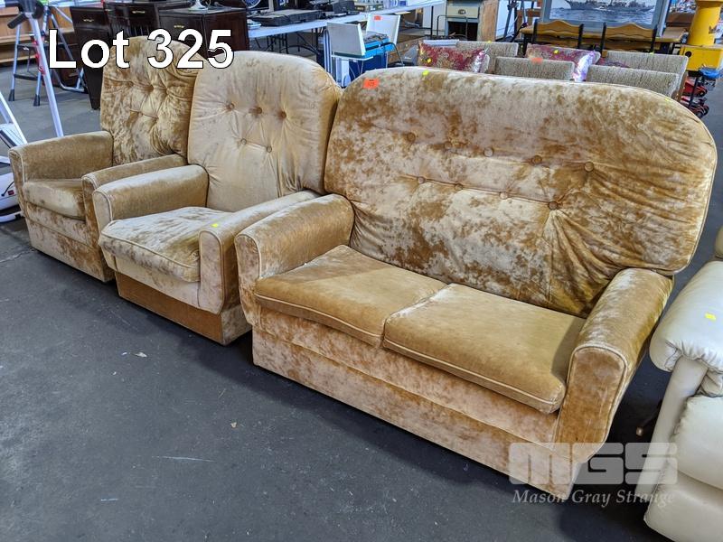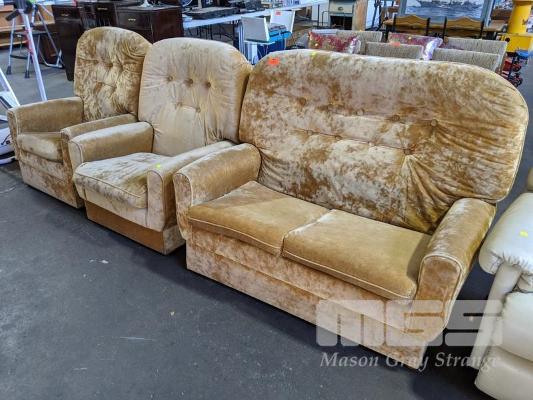 3 PIECE LOUNGE SUITE, GOLD VELVET, 2 SEATER & 2 x SINGLES