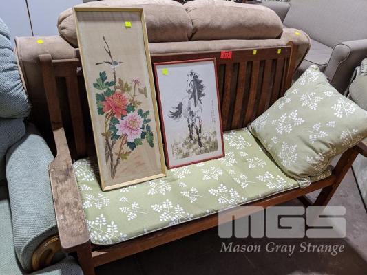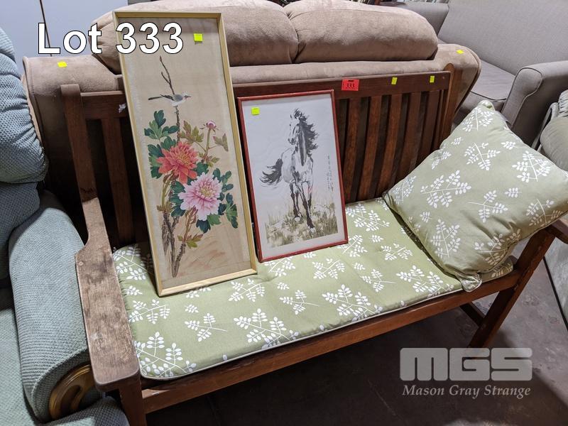 2 SEAT GARDEN CHAIR WITH CUSHIONS & 2 x JAPANESE PRINTS