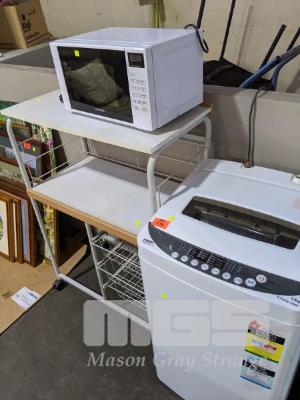 CONTEMPO MICROWAVE, STORAGE UNIT ON CASTORS, HAIER TOP LOAD WASHING MACHINE, 5.5kg