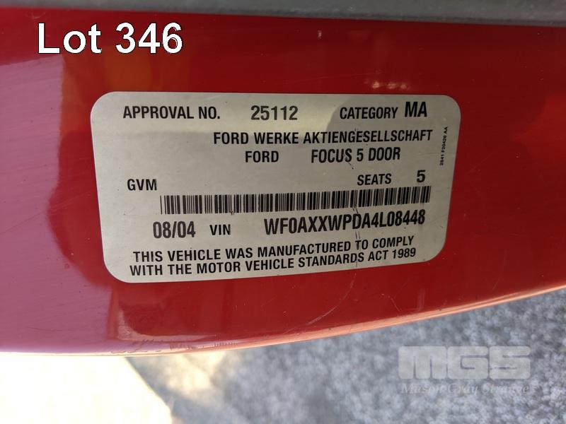 2004 FORD FOCUS HATCH REG: S950 AMC VIN: WF0AXXWPDA4L08448 ODO: 144,769kms SHOWING ZETEC 2 LITRE 4 CYLINDER, AUTOMATIC TRANSMISSION, AIR CON, CENTRAL LOCKING, CRUISE CONTROL, POWER STEERING, ELECTRIC MIRRORS