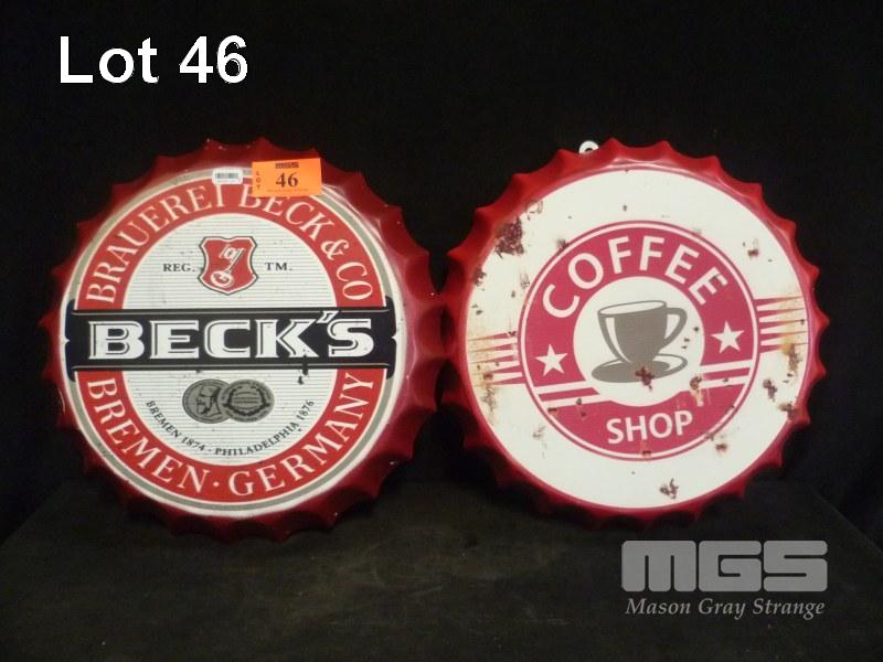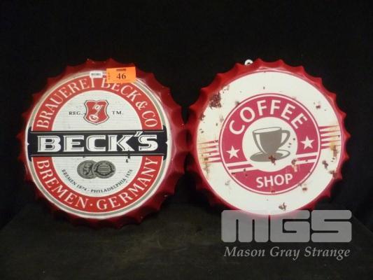 2 x BOTTLE TOP REPRODUCTION TIN SIGNS, BECKS & COFFEE SHOP