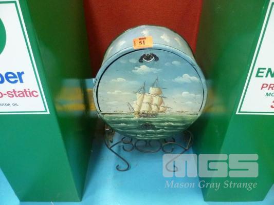 TIMBER CIRCULAR HAND PAINTED SAILING SHIP THEMED STORAGE CABINET ON WROUGHT IRON BASE