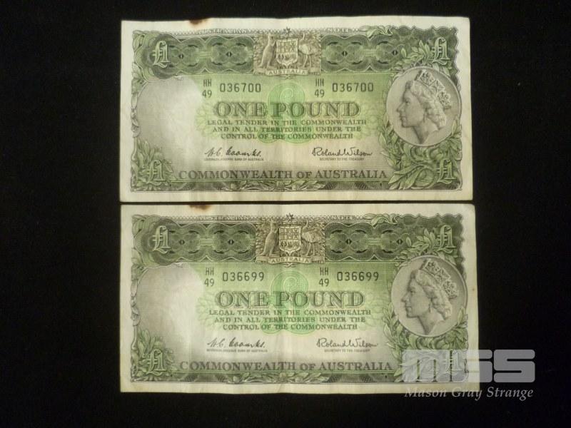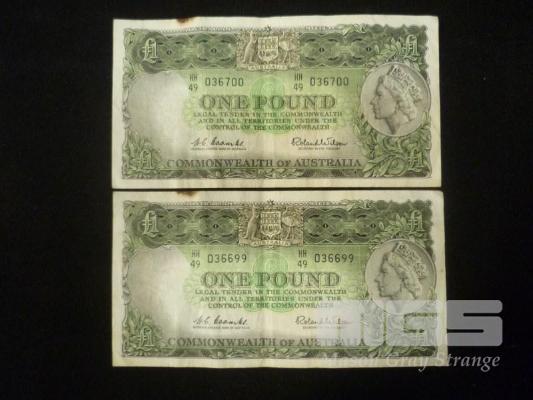 1960 2 X 1 POUND NOTE CONSEC COOMBS WILSON MARK TOP OF NOTES