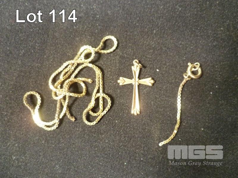 GOLD CRUCIFIX PENDANT, MARKED 9ct, 0.72gm & GOLD NECKLACE, MARKED 333, 4.13gm (BROKEN & REQUIRES REPAIR)
