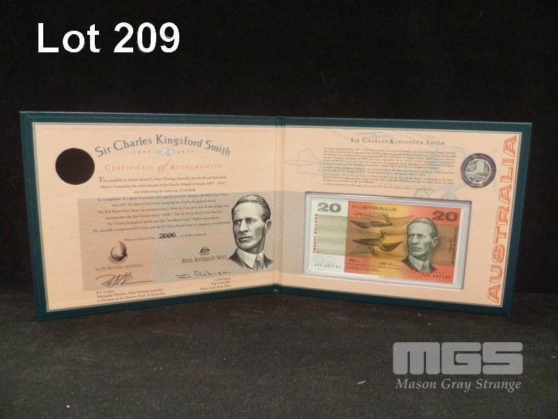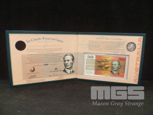 NOTE PRINTING AUSTRALIA/ROYAL AUSTRALIA MINT, 1997, SIR CHARLES KINGFORD SMITH CENTENARY PORTFOLIO, $1 SILVER PROOF COIN & $20 PAPER BANKNOTE