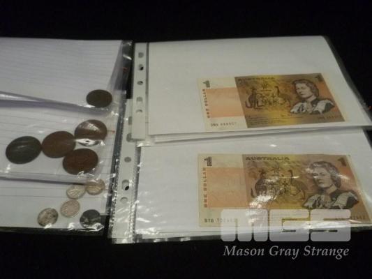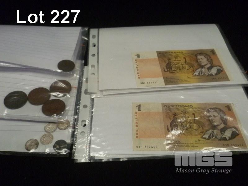 2 X AUSTRALIAN 1 DOLLAR PAPER BANKNOTES, 1972 & 82, PHILLIPS/WHEELER & JOHNSTON/STONE, 4 X PENNIES, 1 X HALF PENNY