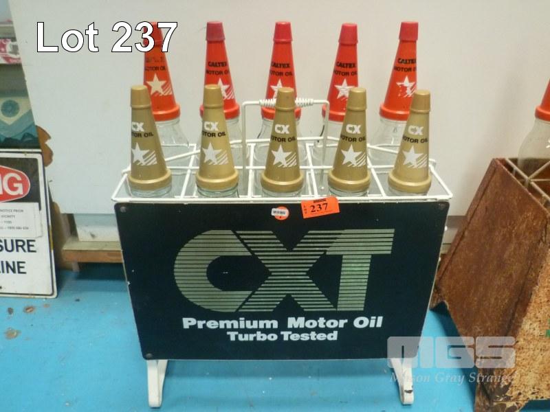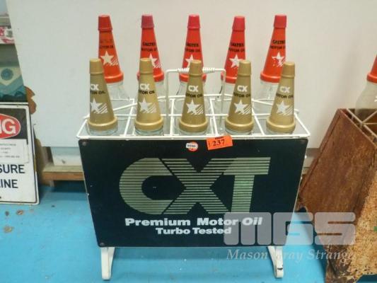 CALTEX CXT OIL BOTTLES, RACK & STAND (10 x BOTTLES & LIDS)