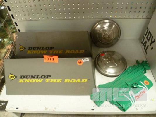 EARLY V8 WHEEL CAPS (2), CASTROL SERVICE STATION BUNTING & DUNLOP TYRE STAND