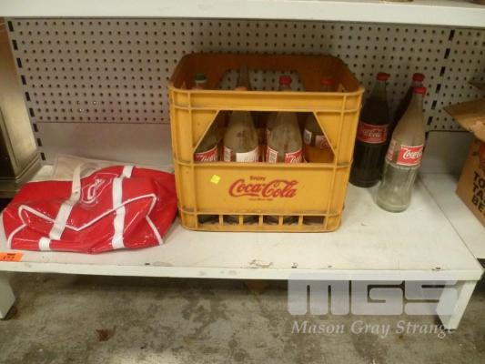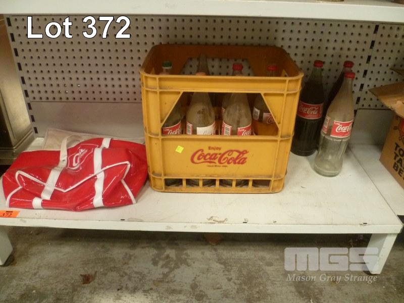 COCA COLA PLASTIC DRINKS CRATE & ASSORTED 1 LTR GLASS BOTTLES, COKE COOLER BAG