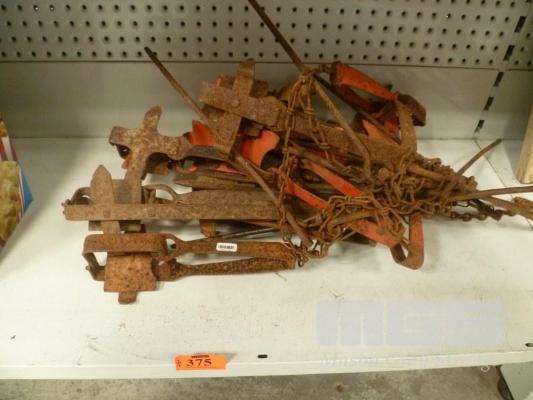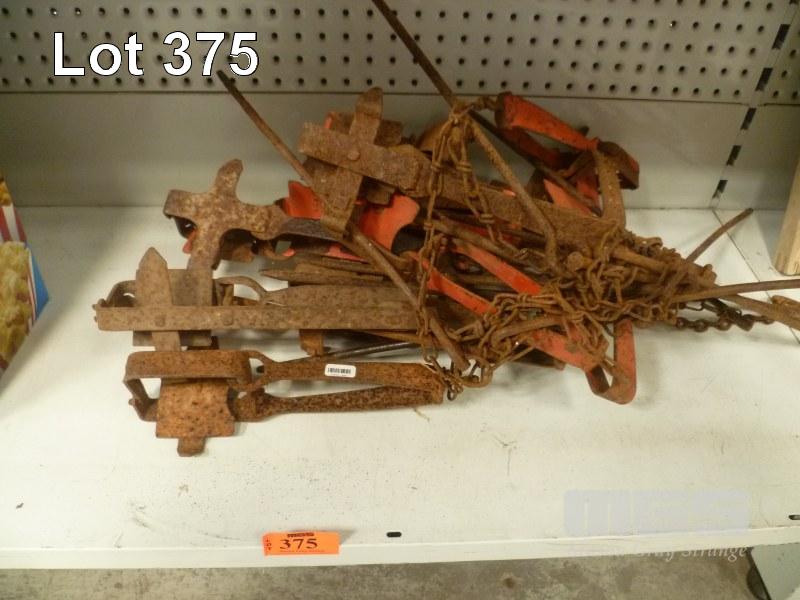 COLLECTION OF VINTAGE RABBIT TRAPS, GALV BASKET & WASHBOARD