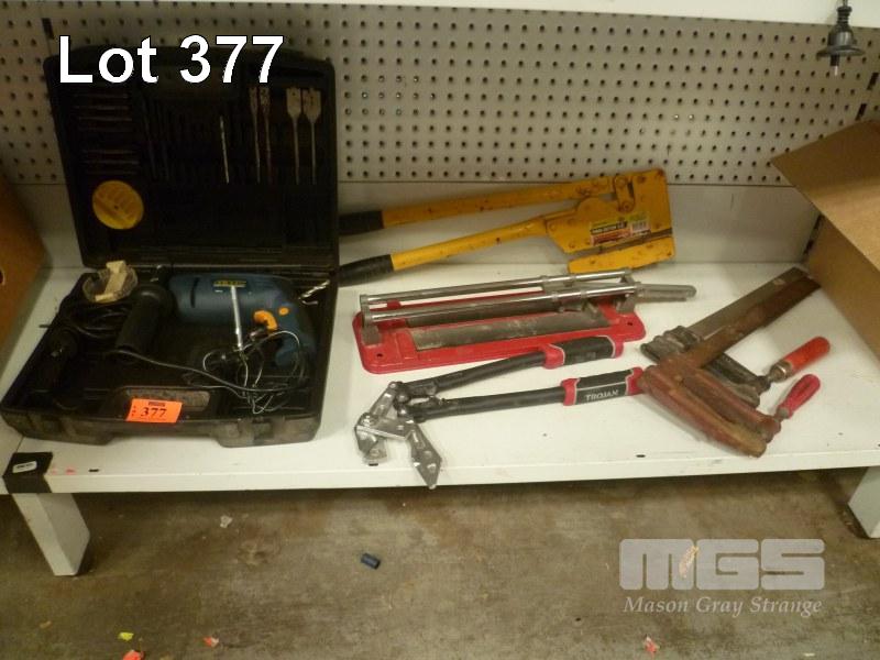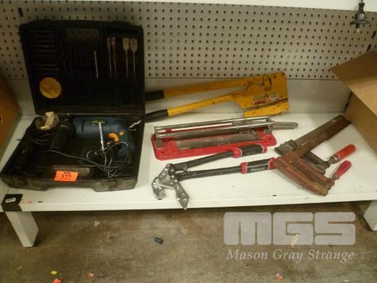 TOOLS, INCL DRILL, G CLAMPS, TILE CUTTER, ETC.