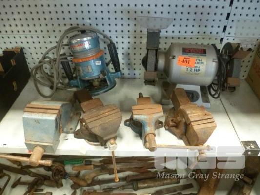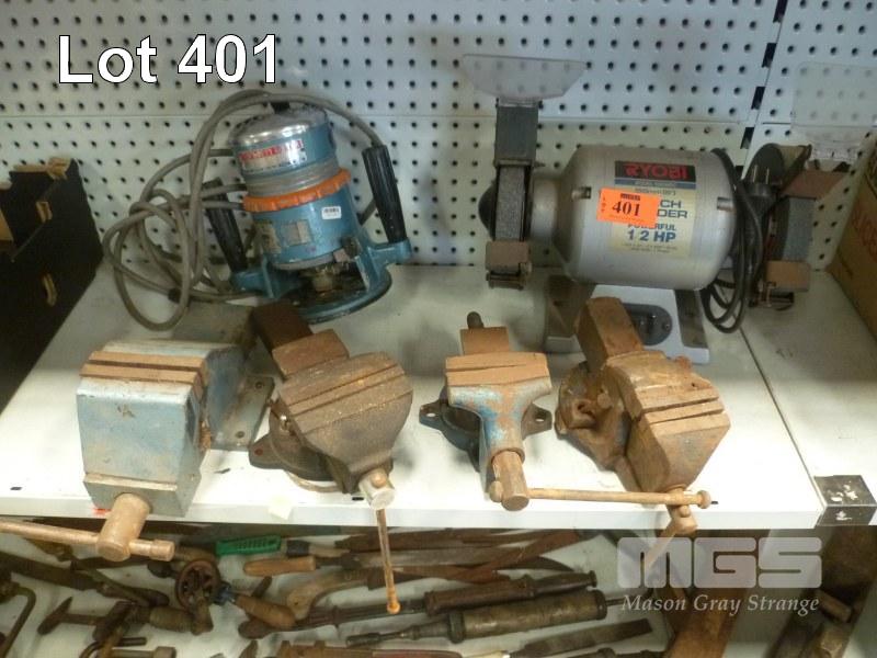 4 x BENCH VIES, RYOBI BENCH GRINDER & TOWA HEAVY DUTY ROUTER