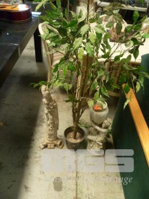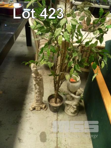 2 x CONCRETE GARDEN STATUES & ARTIFICIAL PLANT