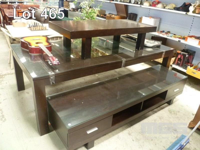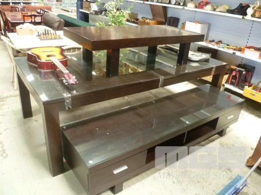 RECTANGULAR DINING TABLE, DARK BROWN TIMBER WITH GLASS PROTECTIVE TOP, 240cm x 120cm MATCHING LOW LINE ENTERTAINMENT UNIT 210cm RECTANGULAR COFFEE TABLE, NO GLASS