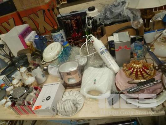 ASSORTED HOMEWARES, GLASSWARE, TEA SET, VACUUM, CANDLE HOLDERS ETC (1 x TABLE)