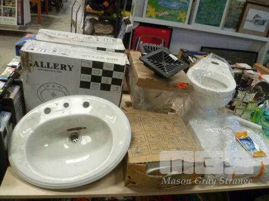 PAIR CERAMIC VANITY BASINS, GEMINI S-TRAP TOILET BASE, WHITELEY S-TRAP TOILET BASE, CAROMA CISTERN & PLASTIC GRATES